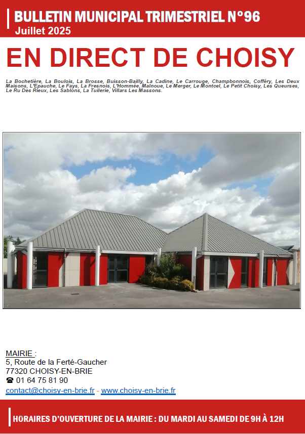 Flash info Information Horaires Plus d'informations Rappel : à compter du 1er septembre 2025, la mairie est ouverte de 9h à 12h, du mardi au vendredi, et les 1er et 3ème samedis du mois. Le 2 septembre 2025